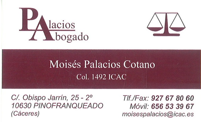 Abogado Palacios C/ Obispo Jarrín, 25 2º 10630 Pinofranqueado 927678060 / 656533967 Dirección C/ Obispo Jarrín, 25 2º Teléfono 927678060 / 656533967 Correo electrónico moisespalacios@icac.es
