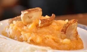 Se sirve en plato de barro, con los trozos de tocino por encima del puré.