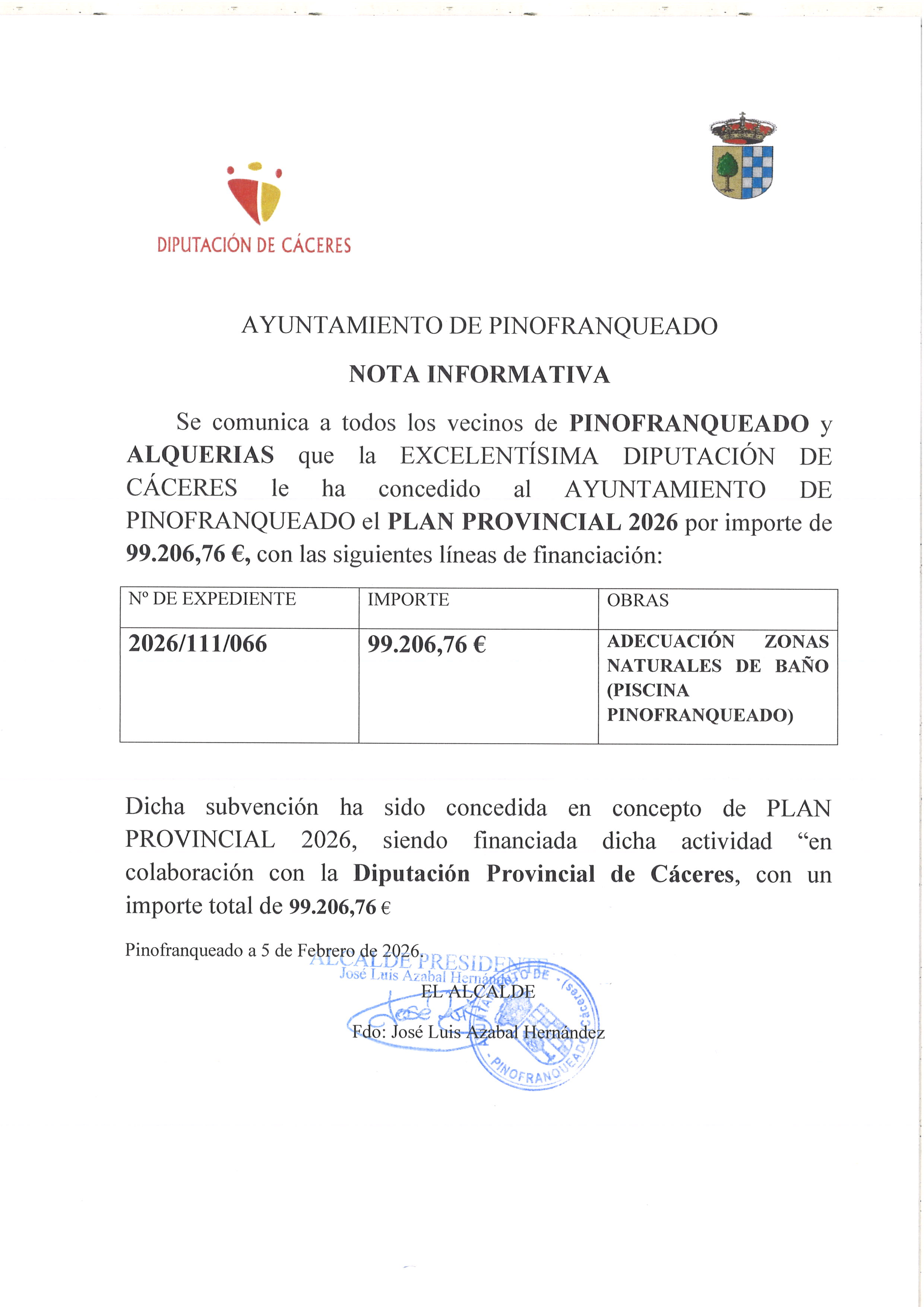 Se comunica a todos los vecinos de PINOFRANQUEADO y ALQUERIAS que la EXCELENTÍSIMA DIPUTACIÓN DE CÁCERES le ha concedido al AYUNTAMIENTO DE PINOFRANQUEADO el PLAN PROVINCIAL 2026 por importe de 99.206,76 €, con las siguientes líneas de financiación: