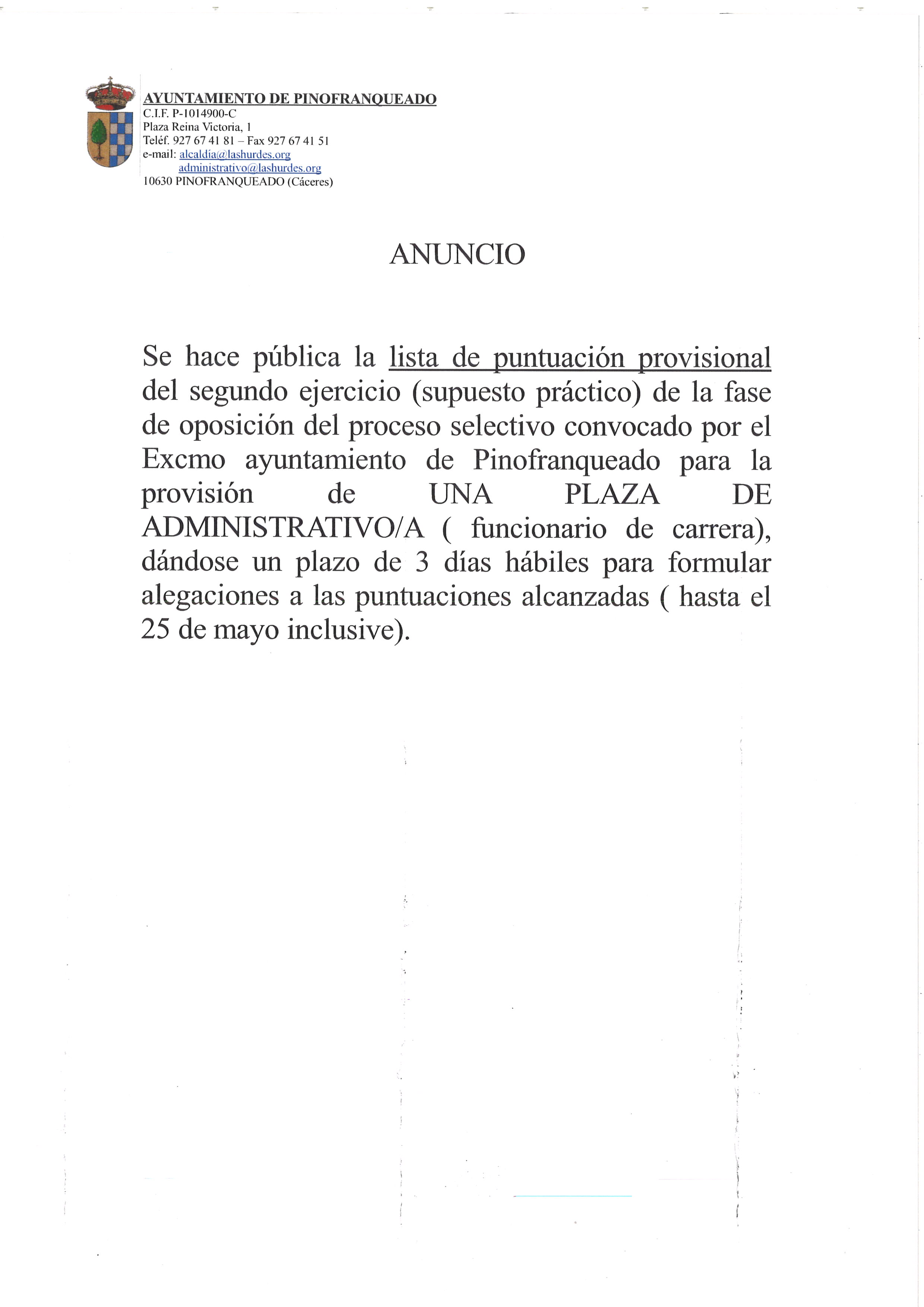 LISTA PROVISIONAL DE PUNTUACIONES 2º EJERCICIO FASE OPOSICIÓN PLAZA ADMINISTRATIVO FUNCIONARIO DE CARRERA 20 mayo 2022 Documentos ACTA DE CORRECCIÓN_signed.pdf (pdf 339,5 kB)