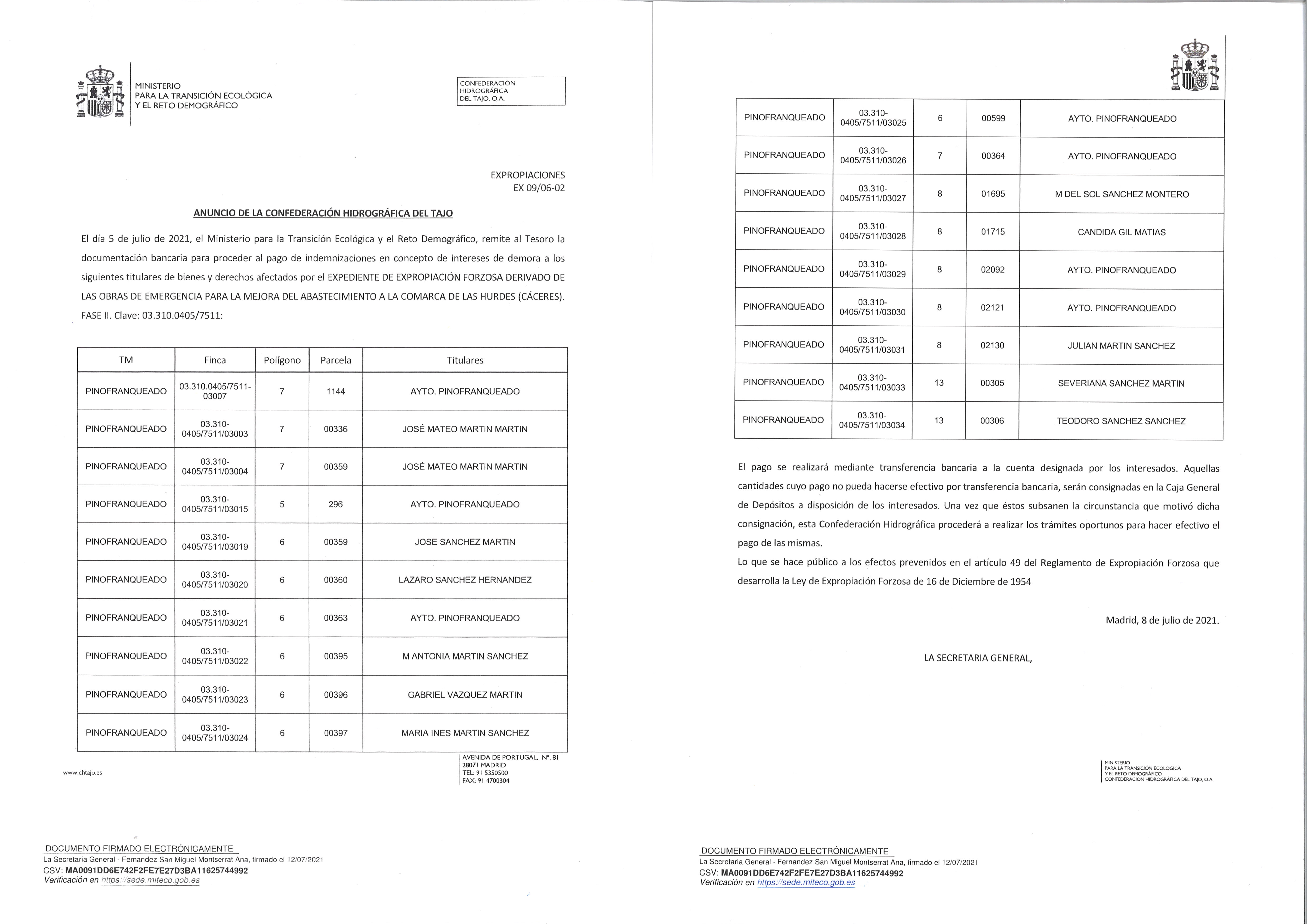 ANUNCIO DE LA CONFEDERACIÓN HIDROGRÁFICA DEL TAJO: EXPEDIENTE DE EXPROPIACIÓN FORZOSA DERIVADO DE LAS OBRAS DE EMERGENCIA PARA LA MEJORA DEL ABASTECIMIENTO A LA COMARCA DE LAS HURDES ( CÁCERES)